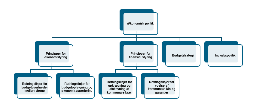 Den seneste politik er vedtaget af kommunalbestyrelsen d. 22. marts 2018. Billedet herunder viser de dokumenter, der indgår i styringen af økonomien: